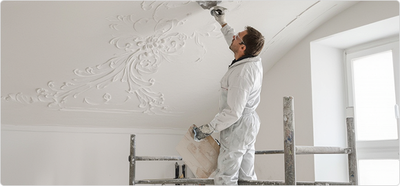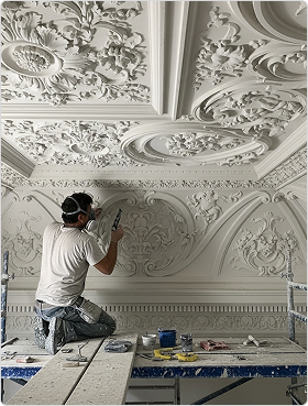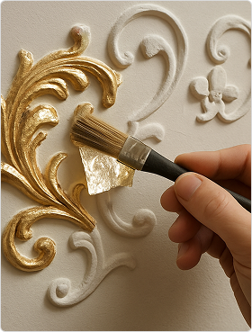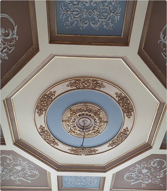 Элементы лепного декора для потолка были индивидуально изготовлены из высококачественной декоративной штукатурки методом формовки и ручной доработки. Завершающим этапом стало нанесение на готовую лепнину сусального золота по классической технологии с целью достижения долговечного и визуально безупречного результата.
